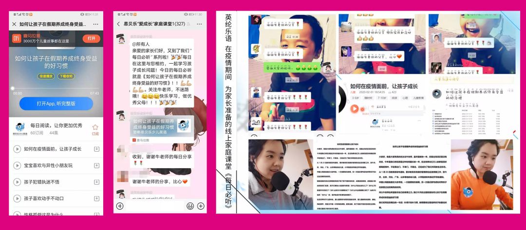 老师们克服在家办公的重重困难,经过几天夜以继日的备课,为学员们呈现了极具品质的线上直播课,同时老师们还在班级群内分享亲子互动视频、优秀学习素材和学习方法,超过1000人次参与学习并录制视频提交学习成果,每一位老师都在群里积极点评、1对1互动沟通。